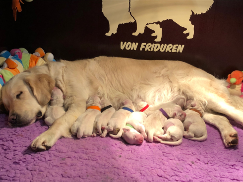Nanuk ist das erste Mal Vater geworden. Im Kennel von Friduren bei Irene Huesmann ist heute der F-Wurf geboren worden. Nanuk und Ava sind stolze Eltern von 5 Rüden und 4 Hündinnen geworden. Ich freue mich sehr über Nanuk's erste Nachkommen und bin gespannt sie bald persönlich kennen zu lernen!